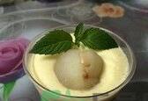 芒果泥80g,荔枝4颗,牛奶200g,淡奶150g,鱼胶片2片(10g),细砂糖20g