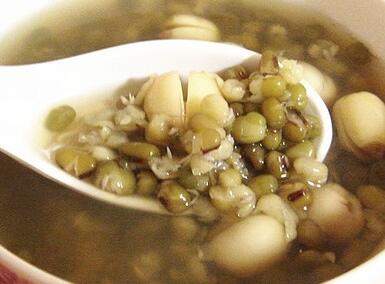 消暑,绿豆与其他食品一起烹调,疗效更好,如绿豆银花汤:绿豆100克、金银花30克,水煎服用。