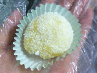 放进纸托!家里没有纸托的可以直接装盘就好了,因为沾了椰蓉,所以不会粘手也不怕沾一起
