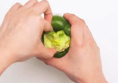 2、随后用大拇指向下抠青椒头部。
