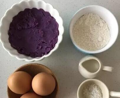 准备材料:紫薯泥120g,鸡蛋3颗,纯牛奶30ml,面粉40g,盐2g