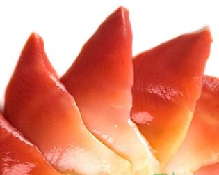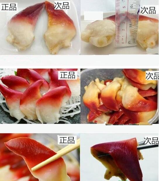 2.解冻状态下:北极贝正品红白颜色分明,有光泽;次品贝头发黄,无光泽;