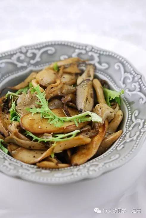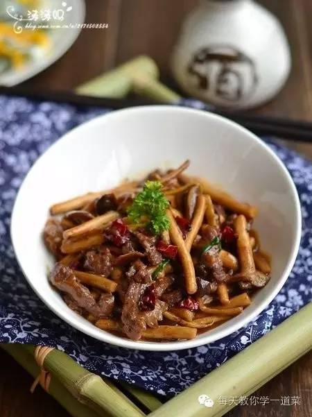 6、加盐、生抽、蚝油调味,待茶树菇全熟用水淀粉勾薄芡即可