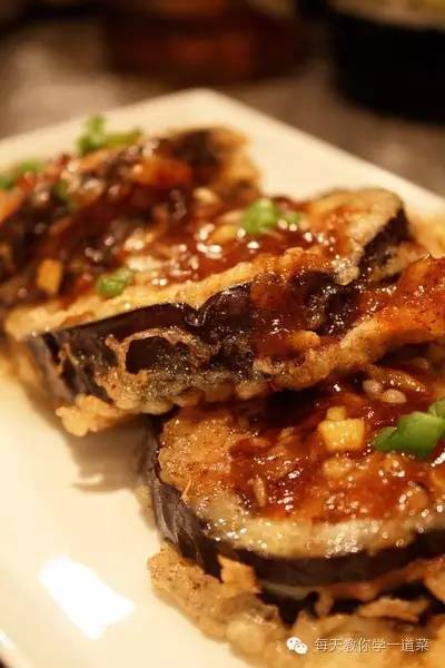 5、 煎软的茄片铲起,锅内留油,下姜葱蒜红椒碎煸香,再倒入一勺豆瓣酱炒香;