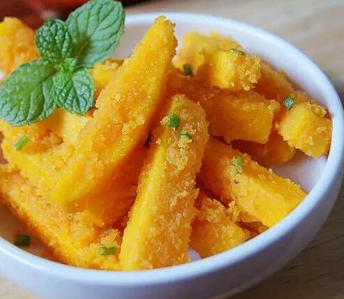 5、坐锅热油,下南瓜煎至表面金黄后铲起备用。