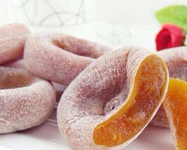 4、上霜:将两饼顶部相合,萼蒂部向外,在缸中放一层干柿皮放一层柿饼,反复叠放至将满缸,然后封缸,放在阴凉处生霜。柿饼上霜与环境温度有关,温度越低,上霜越好,所以要将缸放在阴凉处。