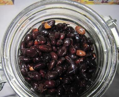 将黑豆洗净,去除里面的杂质,放到通风处阳光下晾干,然后把黑豆倒入玻璃瓶,再将原香醋倒入瓶中,醋冒过豆子,瓶内留三分之一的空间,目的是为黑豆在泡的过程中膨胀而预留足够的空间,最后盖上盖子放到通风阴凉处2个月,即可食用,每天吃两勺,瓶盖上面贴上时间标签,可以查看泡制的时间.