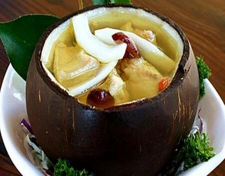鸡:鸡肉肉质细嫩,滋味鲜美,并富有营养,有滋补养身的作用.鸡肉中蛋白质的含量比例很高,而且消化率高,很容易被人体吸收利用,有增强体力、强壮身体的作用.鸡肉含有对人体生长发育有重要作用的磷脂类,是中国人膳食结构中脂肪和磷脂的重要来源之一.鸡肉对营养不良、畏寒怕冷、乏力疲劳、月经不调、贫血、虚弱等有很好的食疗作用.祖国医学还认为,鸡肉有温中益气、补虚填精、健脾胃、活血脉、强筋骨的功效.椰子:椰子主要含有维生素A、C,磷、钾、钠等矿物质,生物素,烟酸,叶酸等.椰肉的含油量约35%,油中的主要成分为癸酸、棕榈酸、油酸、月桂酸、脂肪酸、游离脂肪酸及多种甾醇物质.这些物质具有补充机体营养、美容、防治皮肤病的作用.椰汁有很好的清凉消暑、生津止渴的功效.椰汁还有强心、利尿、驱虫、止呕止泻的功效.常吃椰子利于保持皮肤滋润,健康,有弹性.莲子:莲子含有丰富的蛋白质、碳水化合物、烟酸、钾、钙、镁等营养元素,具有防癌抗癌、降血压、强心安神、滋养补虚、止遗涩精等功效.姜:生姜具有解毒杀菌的作用,所以日常我们在吃松花蛋或鱼蟹等水产时,通常会放上一些姜末、姜汁.生姜中的姜辣素能抗衰老,老年人常吃生姜可除"老年斑".生姜的提取物能刺激胃粘膜,引起血管运动中枢及交感神经的反射性兴奋,促进血液循环,振奋胃功能,达到健胃、止痛、发汗、解热的作用.姜的挥发油能增强胃液的分泌和肠壁的蠕动,从而帮助消化;生姜中分离出来的姜烯、姜酮的混合物有明显的止呕吐作用.生姜提取液具有显着抑制皮肤真菌和杀阴道滴虫的功效,可治疗各种痈肿疮毒;生姜还有抑制癌细胞活性、降低癌变的毒害作用.