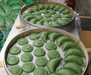 8、包好之后就可以开始蒸了,蒸锅烧开水,垫上一湿屉布。把清明果摆放好,每个之间隔一些空隙。盖上盖大火蒸5分钟。(咸清明果要多蒸2分钟),开盖即可食。