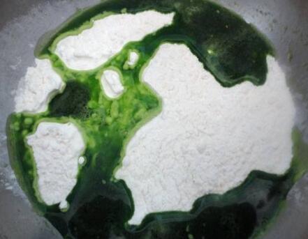 2、先将面粉倒入盆内,加菠菜汁和成硬面团盖湿布稍饧。