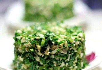 四、将苦菜攥净水,加细盐与蒜沫(蒜多些好),稍微揉搓。