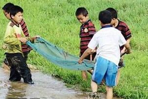 等待河水排干后,先把其他活蹦乱跳的小鱼捉完。