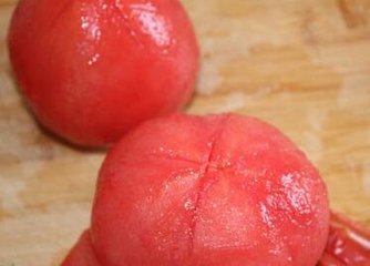 还有个更简单的方法:可以先把西红柿的两面用刀划上十字,然后再把西红柿放入开水中,不到两分钏,划开的地方就会裂开,顺着裂开的地方一撕,皮就全部掉啦。