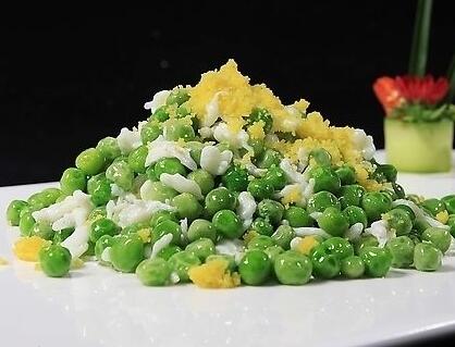 4、下入豌豆,加盐,鸡精翻炒均匀即可。