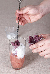 将一杯果昔中的每个水果分开打成果昔,所使用的冰块量多,水果量少,可打得较稀、较水,再倒入成品杯中,就能产生分层效果。例如:西瓜、芒果分开打成2杯果昔,再依序倒入杯中,可呈现红、黄两色的明显分层。