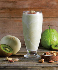 2、芭乐、香瓜、奇异果、综合坚果和冰块1又1/2杯放入果汁机中混合搅打均匀,倒入成品杯中,倒入成品杯中。再倒入优酪乳拌匀即可。