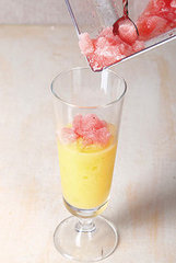 4、取一成品杯,依序倒入作法3的芒果冰沙、作法2的西瓜冰沙即可。