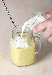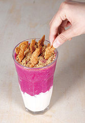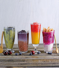 乳制品不加入果汁机一起搅打,只单纯将水果打成冰沙,倒入杯中后,再拌入鲜奶、优酪乳、冰淇淋等各种乳制品,或是加芝麻粉等其他杂粮谷粉也能产生渲染效果。