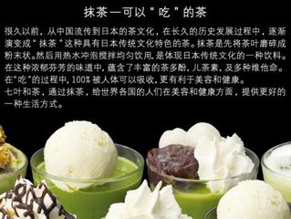 抹茶冰果: 先将一平匙抹茶倒入碗,冲入鲜榨的苹果汁(超市购买代替亦可),用茶筅将抹茶刷开后,倒入玻璃杯中,加入冰块,即成一杯天然翠绿色、茗香加果香、带着日本风味的 “抹茶冰果”!