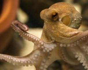 章鱼体呈短卵圆形,无鳍。头上生有8条腕,故又称“八带鱼”。腕间有膜相连,长短相等或不相等,腕上具有2行无柄的吸盘。章鱼的头胴部约7——9.5厘 米。短蛸的腕长约12厘米,长蛸的腕长约48.5厘米,真蛸的腕长约32.5厘米。平时用腕爬行,有时借腕间膜伸缩来游泳,或用头下部的漏斗喷水作快速退游。
