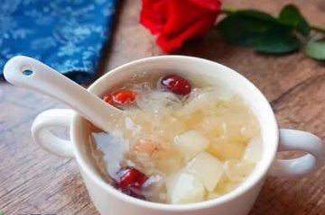 【做法】将撕好的银耳、冰糖、切好的梨和枸杞放在锅里,加适量的凉水,炖煮至开锅,改成文火炖煮,煮到汤黏黏的就可以了。