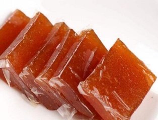 南酸枣糕色泽黄褐色,均匀一致香味纯净,具有酸枣香气口味酸甜可口,具有酸枣滋味,口感韧软,略具咀嚼性,糕体呈半透明状。