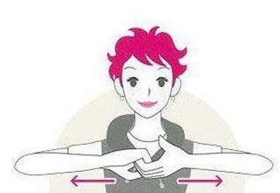 两手上下勾住放在胸前,尽量张开胸部,然后两手分别向相反方向用力拉动,如此坚持20秒,重复3次,接着交换左右手的上下位置,左右手分别完成一次算1组,如此重复5组。