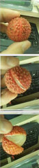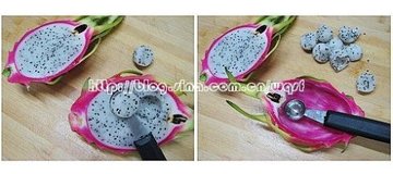 2、用挖球器将火龙果果果肉挖成球状,火龙果皮可以做为盛水果的容器。