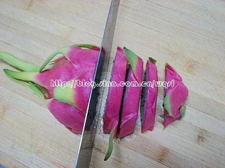 1、将火龙果洗净,纵向对半剖开,切厚片。