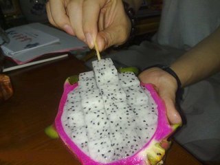 用刀在火龙果的中间如切豆腐般横竖划开,注意别把划破。