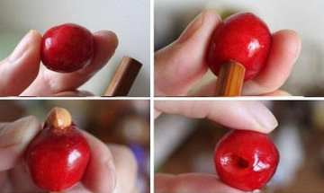 4、微微使劲将筷子捅过去,这时你会发现樱桃核一下子就被捅出来了,不会带一点果肉,而且去核后的樱桃非常完整漂亮。