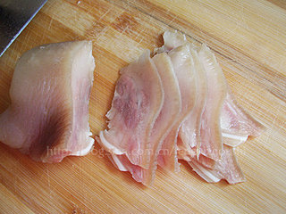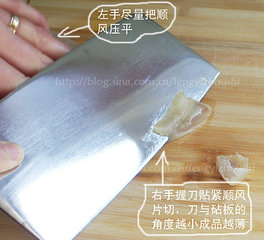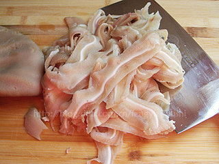 猪耳朵买回来之后,先把猪耳朵飞水洗干净再换水用生姜煮熟,煮到六-八成熟,放至凉透,热的温的都切不好的。从耳尖开始片切,斜着切,刀工要稳,第一要薄,第二要大张,第三要有层次(既要有软骨,也要有肉,还要有皮)。