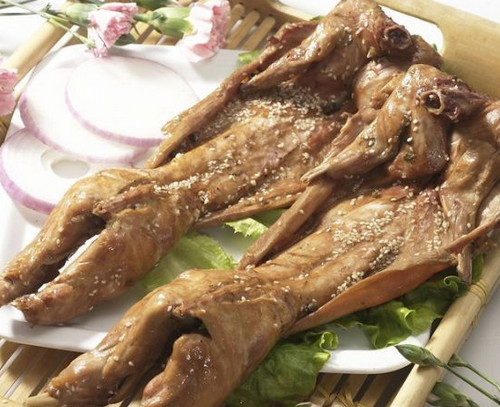 兔肉包括家兔肉和野兔肉两种,家兔肉又称为菜兔肉。兔肉性凉味甘,在国际市场上享有盛名,被称之为保健肉、荤中之素、美容肉、百味肉等等。每年深秋至冬末间味道更佳,是肥胖者和心血管病人的理想肉食,全国各地均有出产和销售。