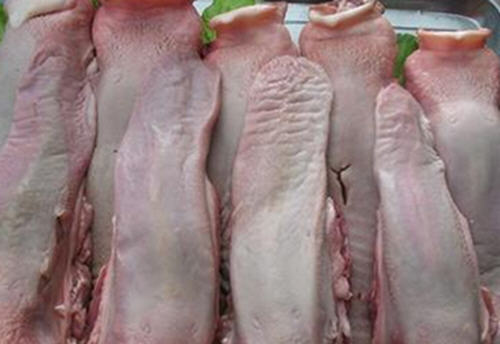 新鲜猪舌头灰白色包膜平滑,无异块和肿块,舌体柔软有弹性,无异味。