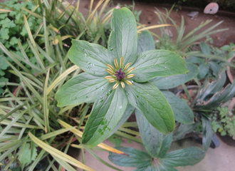 【植物形态】:多年生草本,高50-100厘米。根状茎粗壮,圆锥状或圆柱状,粗可达3厘米,具多数环状结节,棕褐色,具多数须根。茎直立,圆柱形,不分枝,基部常带紫色。叶7-10片,轮生于茎顶,长圆形、椭圆形或倒卵状披针形,长7-15厘米,宽2.5-5厘米,先端急尖或淅尖,基部圆形,稀楔形,全缘,无毛;叶柄 长2-5厘米通常带紫色色。花单生于茎顶,在轮生叶片上端;花梗 长5-16(30)厘米;外轮花被片(萼片)4-6,形大,似叶状,椭圆状披针形或卵状披针形,绿色,长3.5-8厘米,内轮花被片(花瓣)退化呈线状,先端常渐尖,等长或长于萼片2倍;雄蕊8-12枚,花丝与花药近等长,药隔突出部分长0.5-1⑵毫米;子房圆锥状,有5-6棱;花柱粗短,4-6枚,紫色,蒴果近球形,3-6瓣裂。种子多数。花期7-8月,果期9-10月。