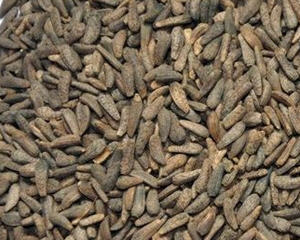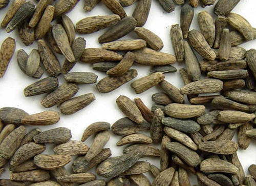 瘦果长倒卵形,两端平截,略扁微弯,长5-7mm,直径2-3mm。表面灰褐色或淡灰褐色,具多数细小黑斑,并有明显的纵棱线。先端较宽,有一圆环,中心有点状凸起的花柱残迹;基部狭窄,有圆形果柄痕。质硬,折断后可见子叶两片,淡黄白色,富汕性。果实无臭;种子气特异,味苦微辛,稍久有麻舌感。以粒大、饱满、色灰褐者为佳。