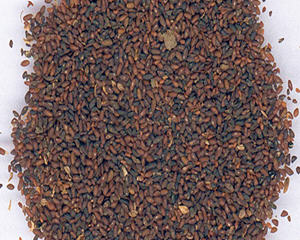 本品呈椭圆形、不规则长圆形或三角状长圆形,略扁,长约2mm,宽约1mm。表面黄棕色至黑褐色,有细皱纹,一面有灰白色凹点状种脐。质硬。气微,味淡。以粒大、色黑、饱满者为佳。