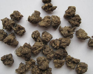本品呈块根纺锤形,多5-6个簇生,形似猫爪,长3-10mm,直径2-3mm,顶端有黄褐色残茎或茎痕。表面黄褐色或灰黄色,久存色泽变深,微有纵皱纹,并有点状须根痕和残留须根。质坚实,断面类白色或黄白色,空心或实心,粉性。气微,味微甘。以色黄褐,质坚实者为佳。