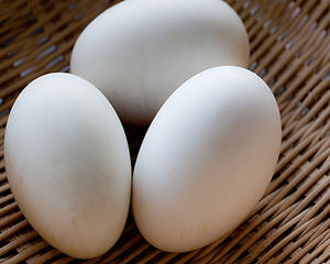鹅蛋,是家禽鹅生下的卵。鹅蛋成椭圆形,个体很大,味道有些油,新鲜的鹅蛋必须烹饪后食用。鹅蛋每颗约重225~280克,较一般鸡蛋约大四五倍。表面较光滑,呈白色,其蛋白质含量低于鸡蛋;脂肪含量高于其他蛋类,鹅蛋中还含有多种维生素及矿物质,但质地较粗糙,草腥味较重,食味不及鸡鸭蛋。
