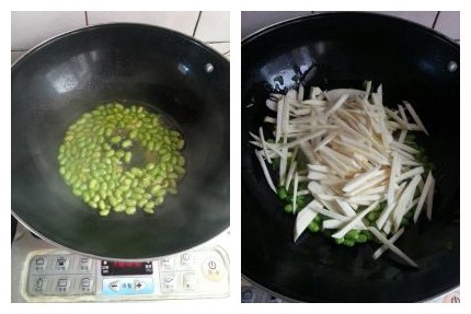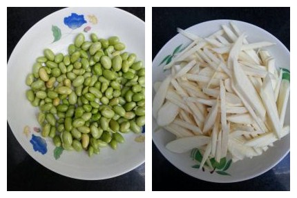 1.黄豆洗净,把黄豆外面那层薄薄的皮拿掉。茭白洗净切成丝备用。