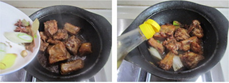 3.排骨糖色炒好后将大料也一起炒一下,更能激发大料的香味;