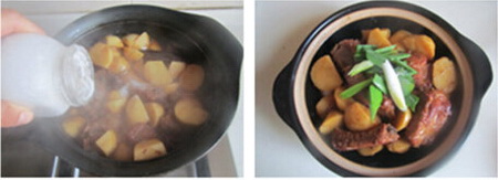 11.揭开盖,加入盐和胡椒粉翻炒均匀后大收汁;