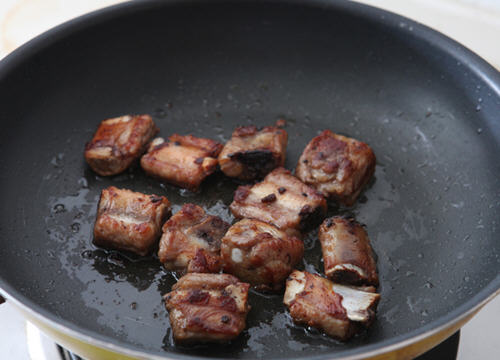 3、平底锅倒入少许食用油,下入排骨铺平,小火慢煎。
