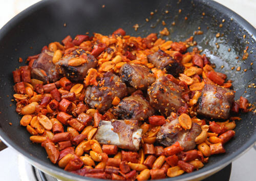 6、来回翻炒,直至排骨裹上满满的辣花生,花生辣椒变得稍焦脆。