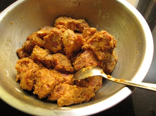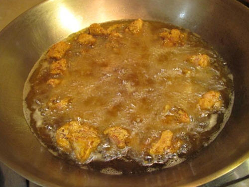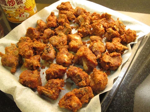 4、大约炸约10分钟,拿根筷子刺肉块,看是否能刺过(避开骨头),熟透后,即可改转大火,将含油及多余的水份逼出