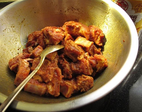 1、排骨洗净沥干加入调味料搅拌均匀,封上保鲜膜,移到冰箱静置1小时待入味。
