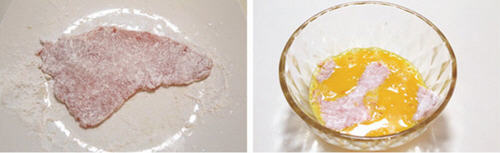 5、将肉放入蛋液中。使肉片每个地方都匀均的粘上蛋液。