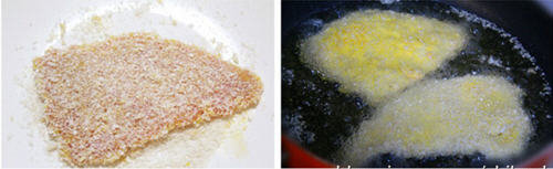 7、平底锅中倒入食用油,油烧到六成热的时候,将肉排放入锅中,中火炸至表面金黄时捞出。待全部炸完后,将油温再烧高一点,然后所有猪排再次放入锅中,快炸三十秒捞出,沥干油份,切成小块即可食用。