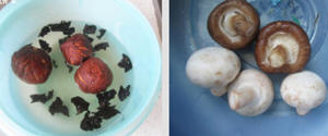 配料:干花菇和黑木耳,鲜香菇和白蘑菇