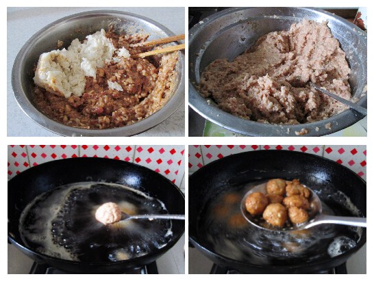 11、锅中注入油烧至6成热,将肉馅制成小丸子依次放入油锅。